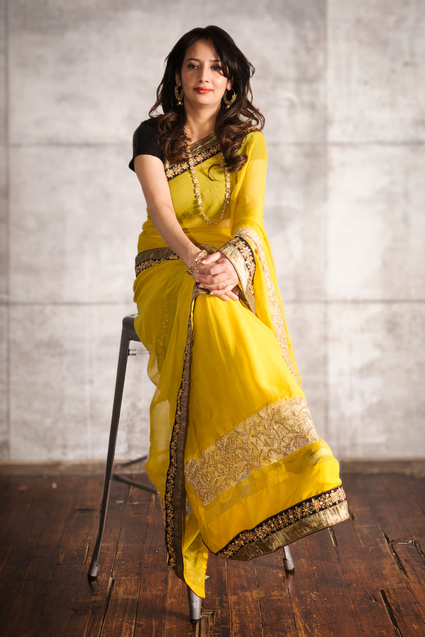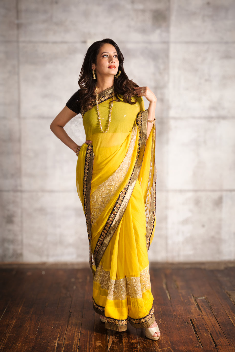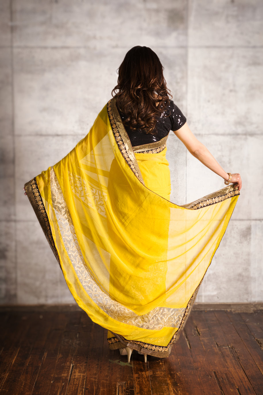 This is a beautiful yellow saree with a black velvet/ tissue border that is lined with tilla and kalabato work.