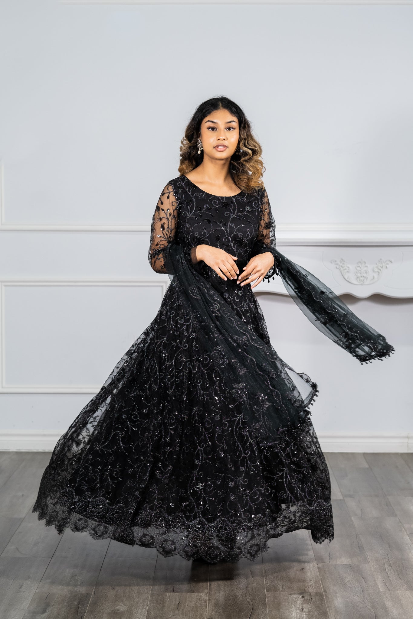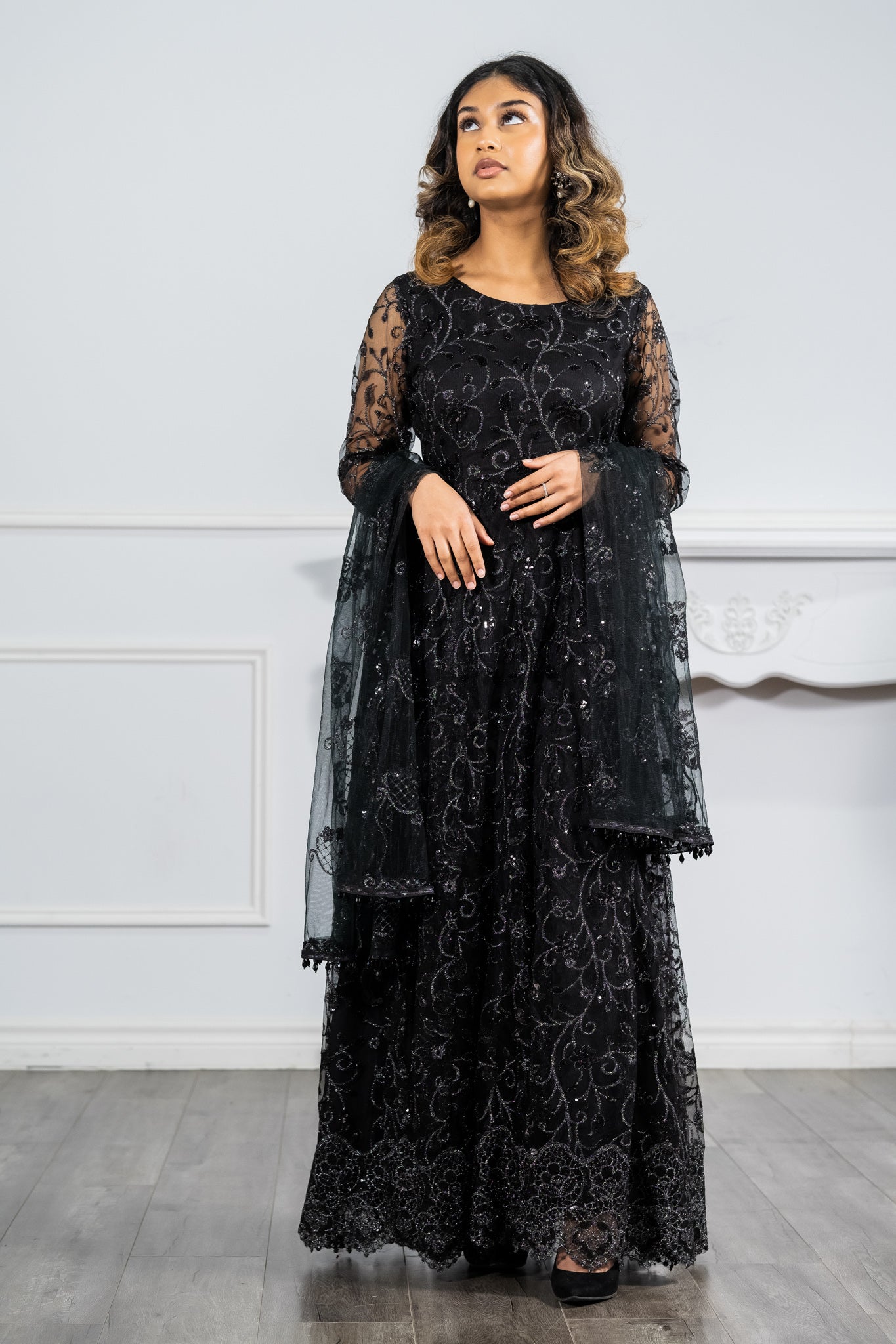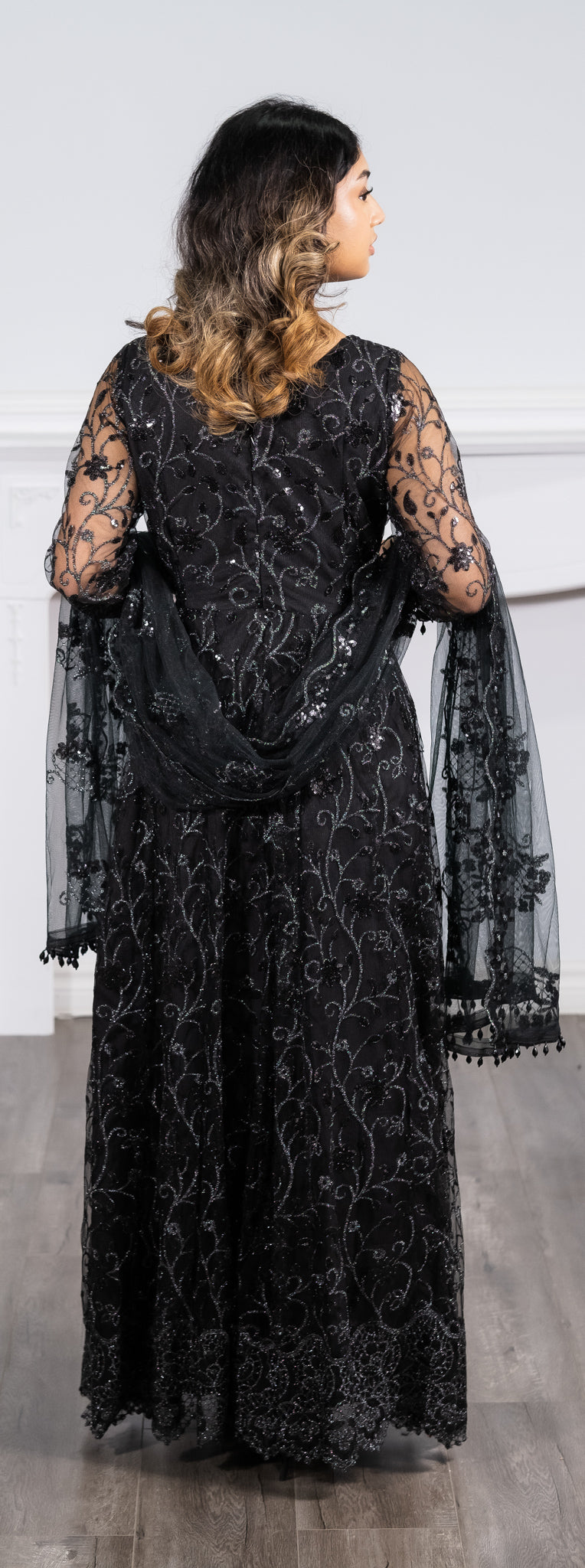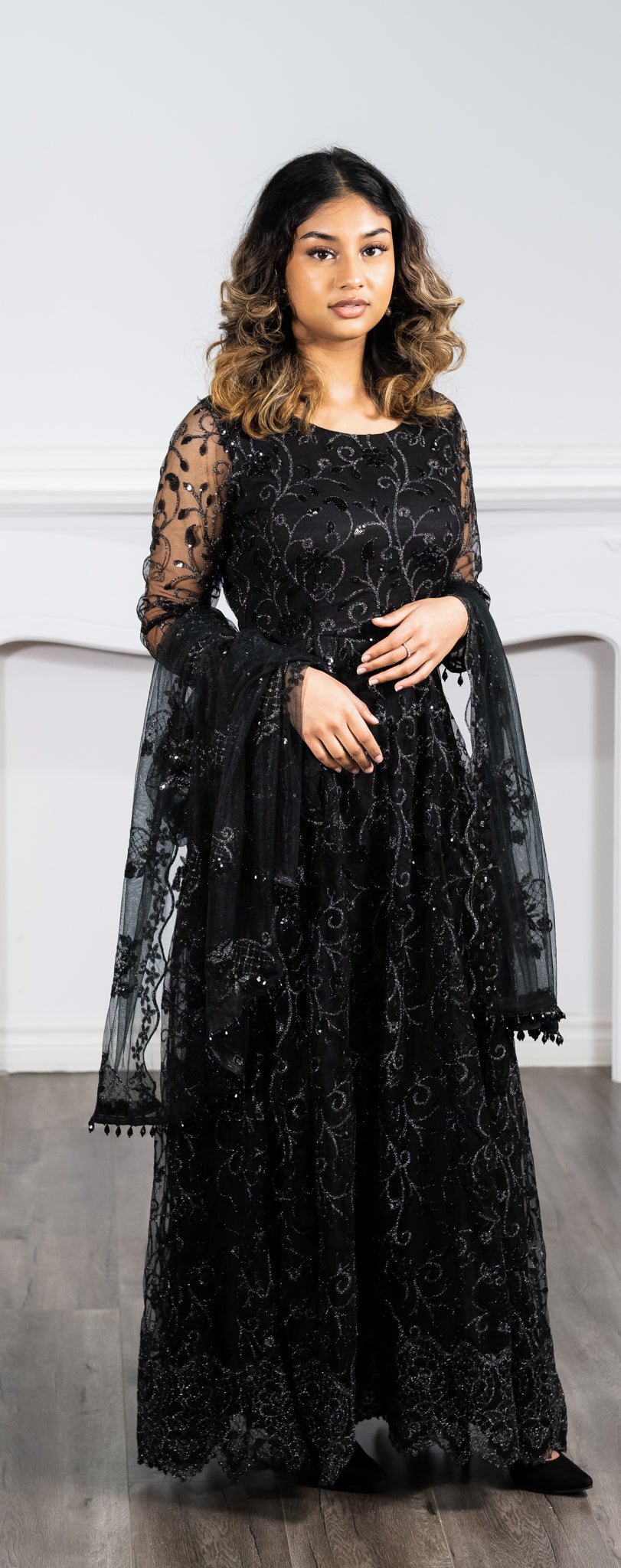 2 pc: black net dress with a black dupatta