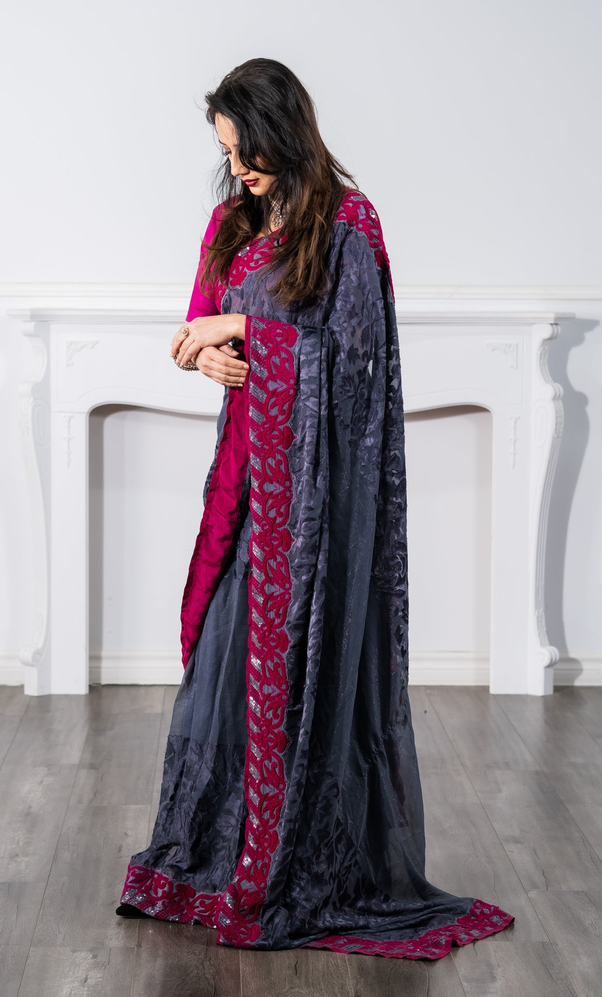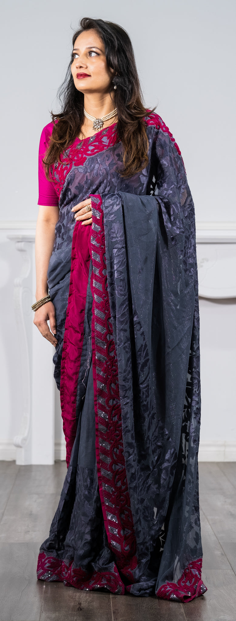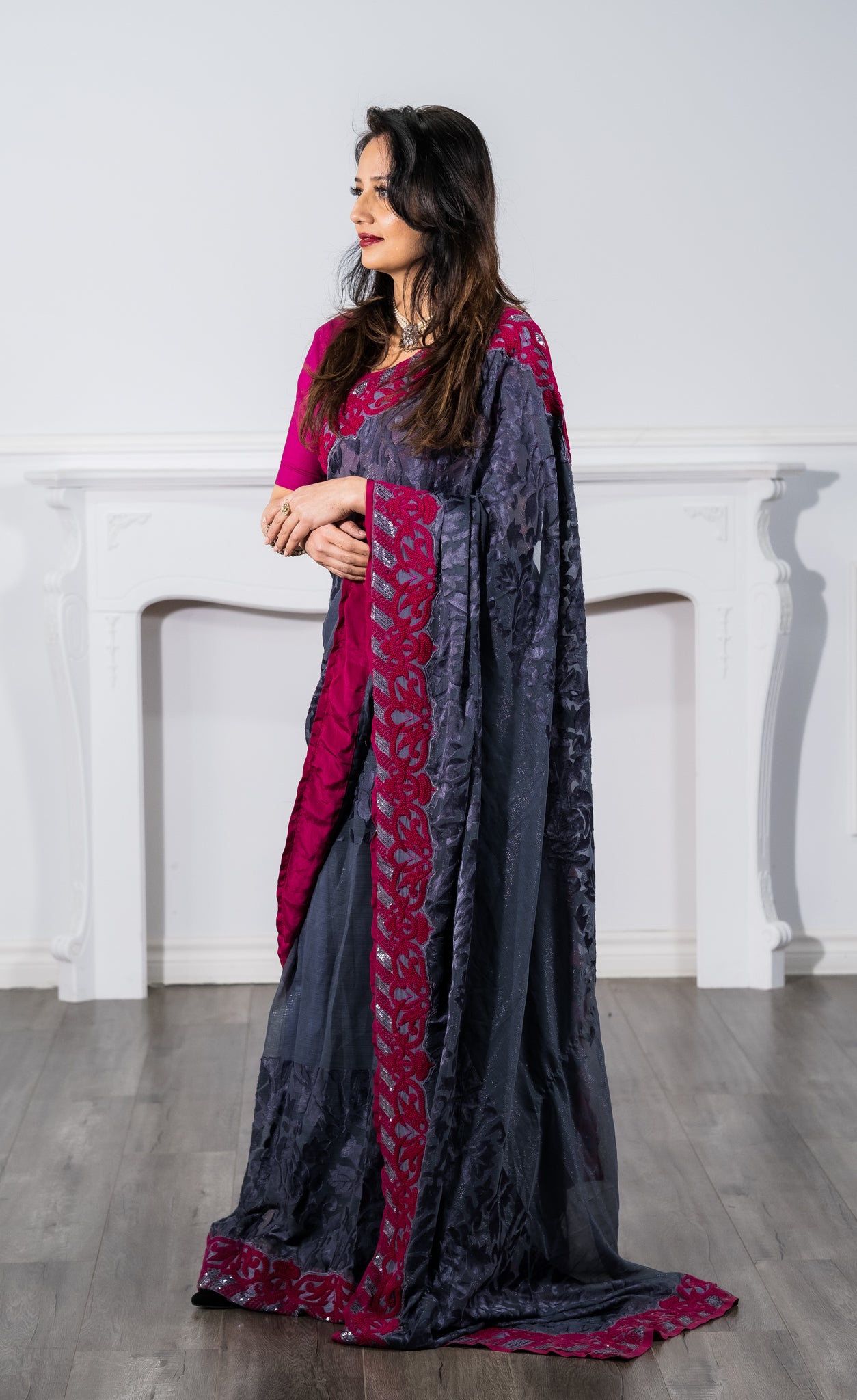 This is a beautiful saree with a shocking pink resham and sequins work on the border.