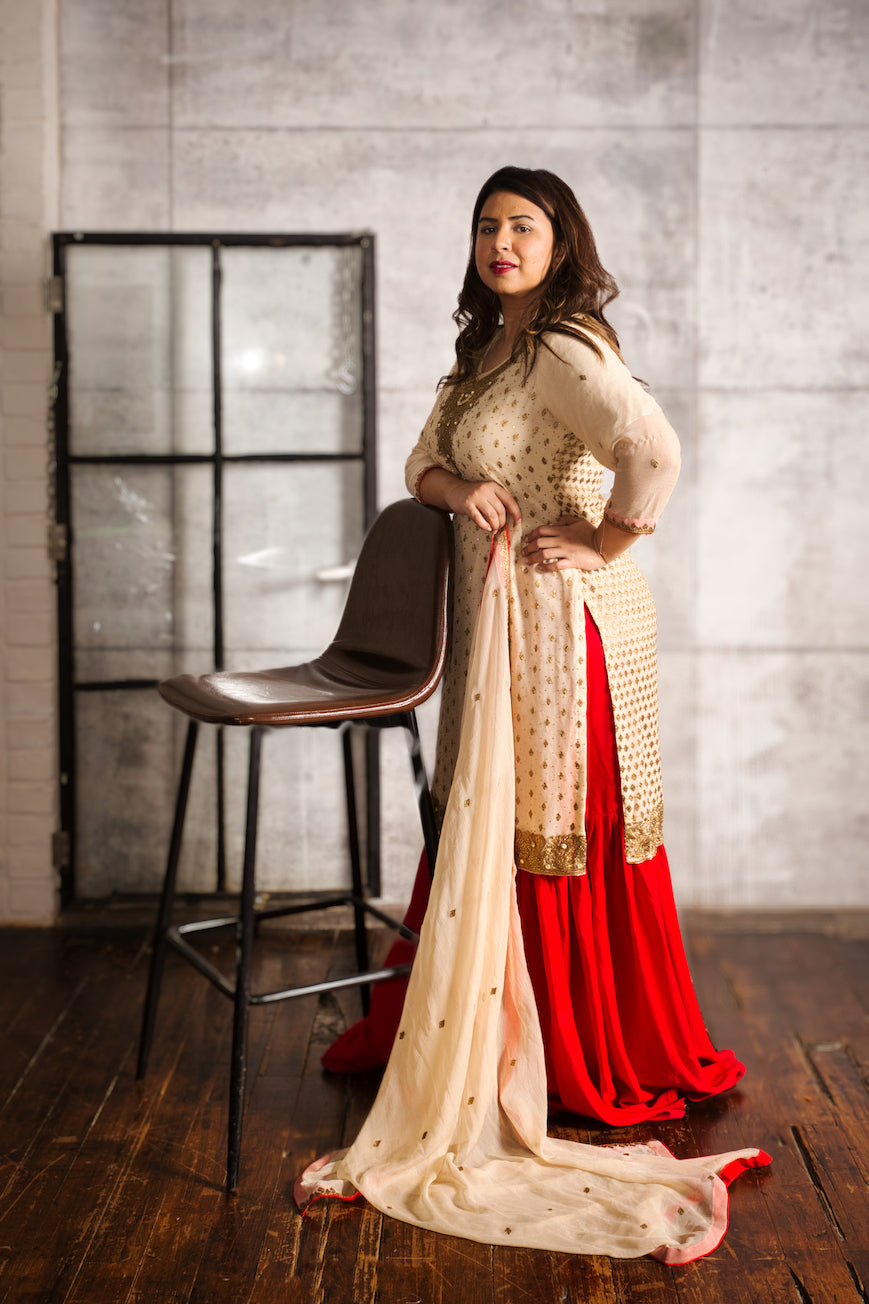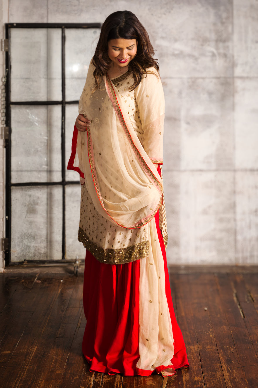 3 piece suit: includes a chiffon shirt, chiffon dupatta and a gharara