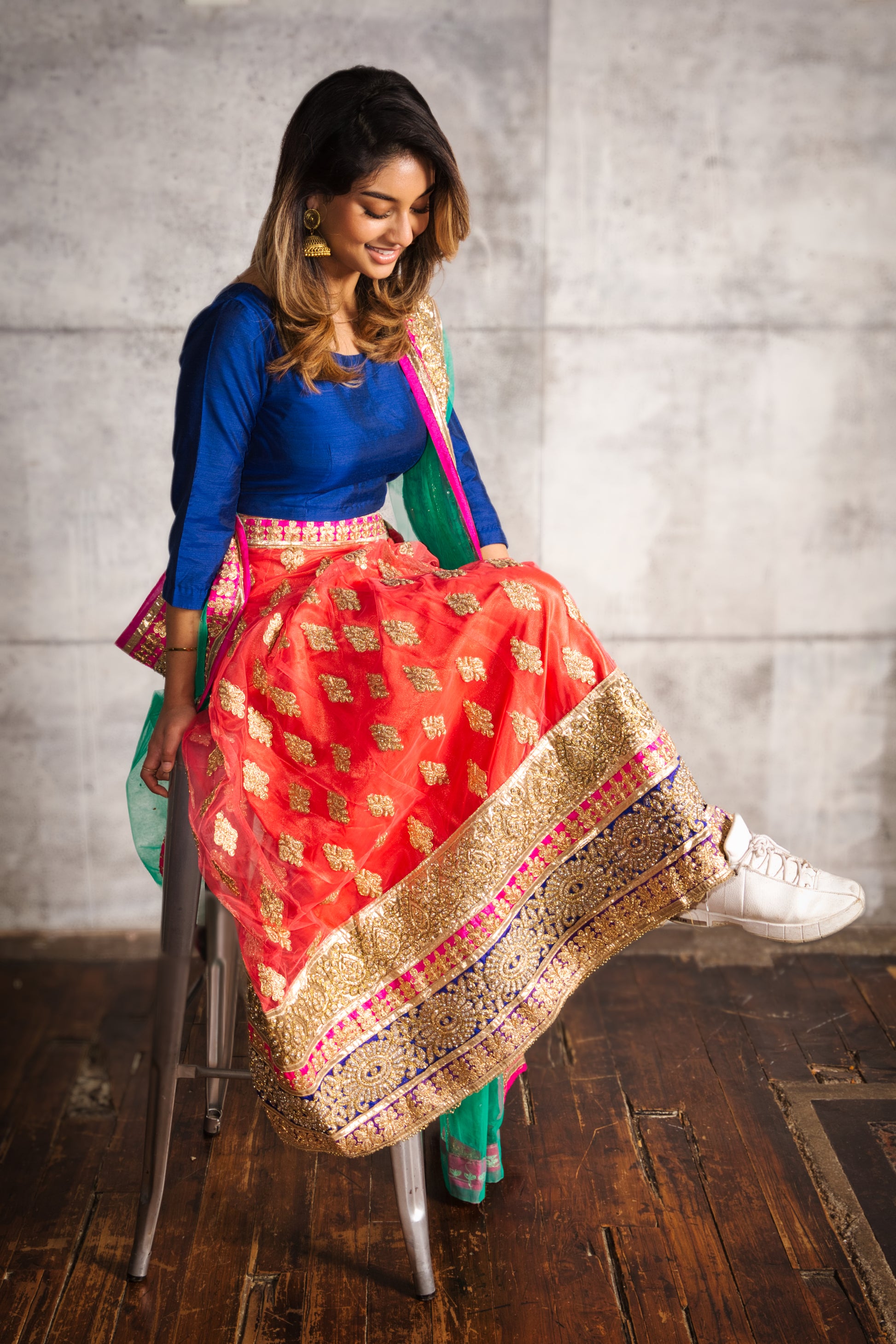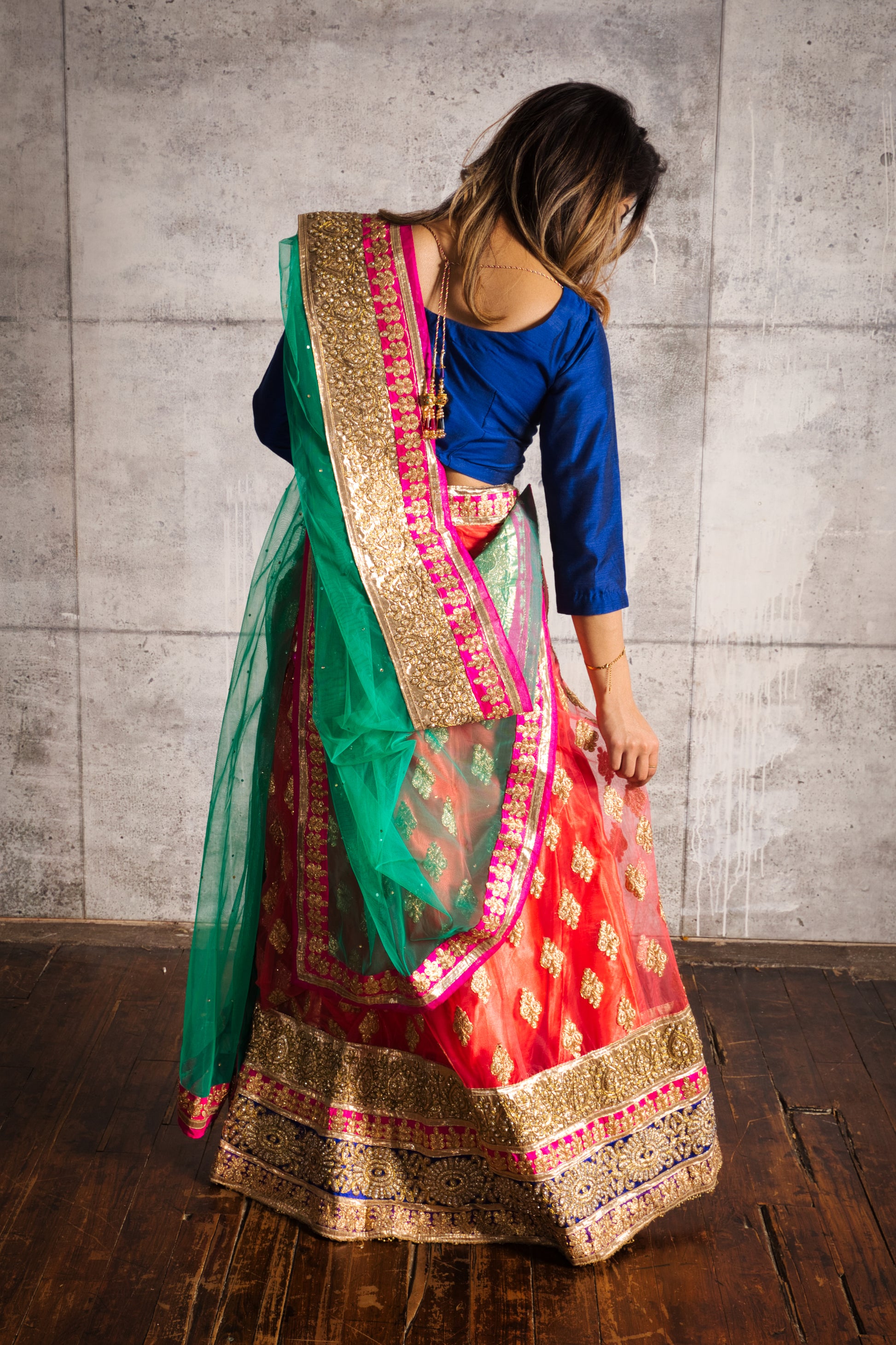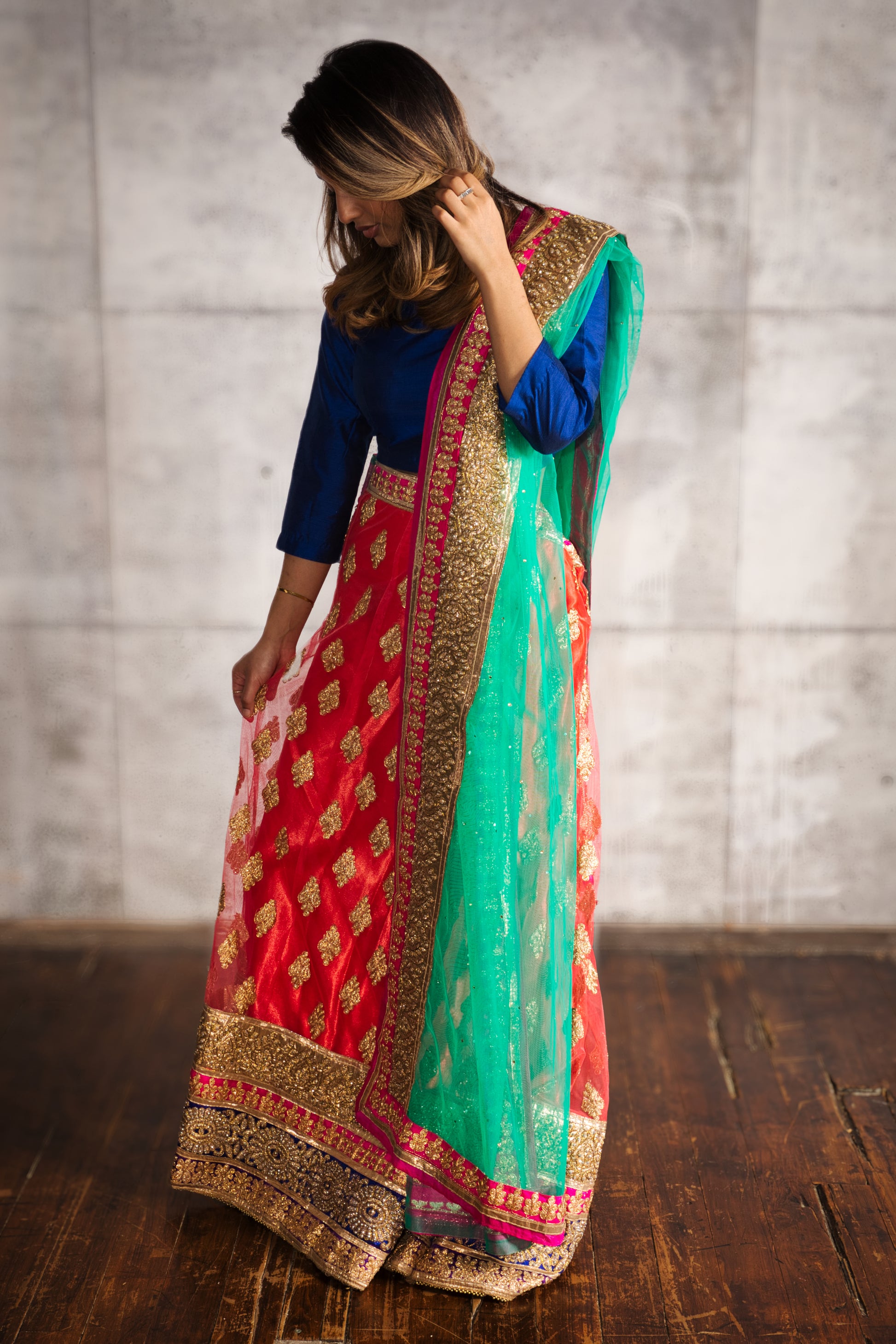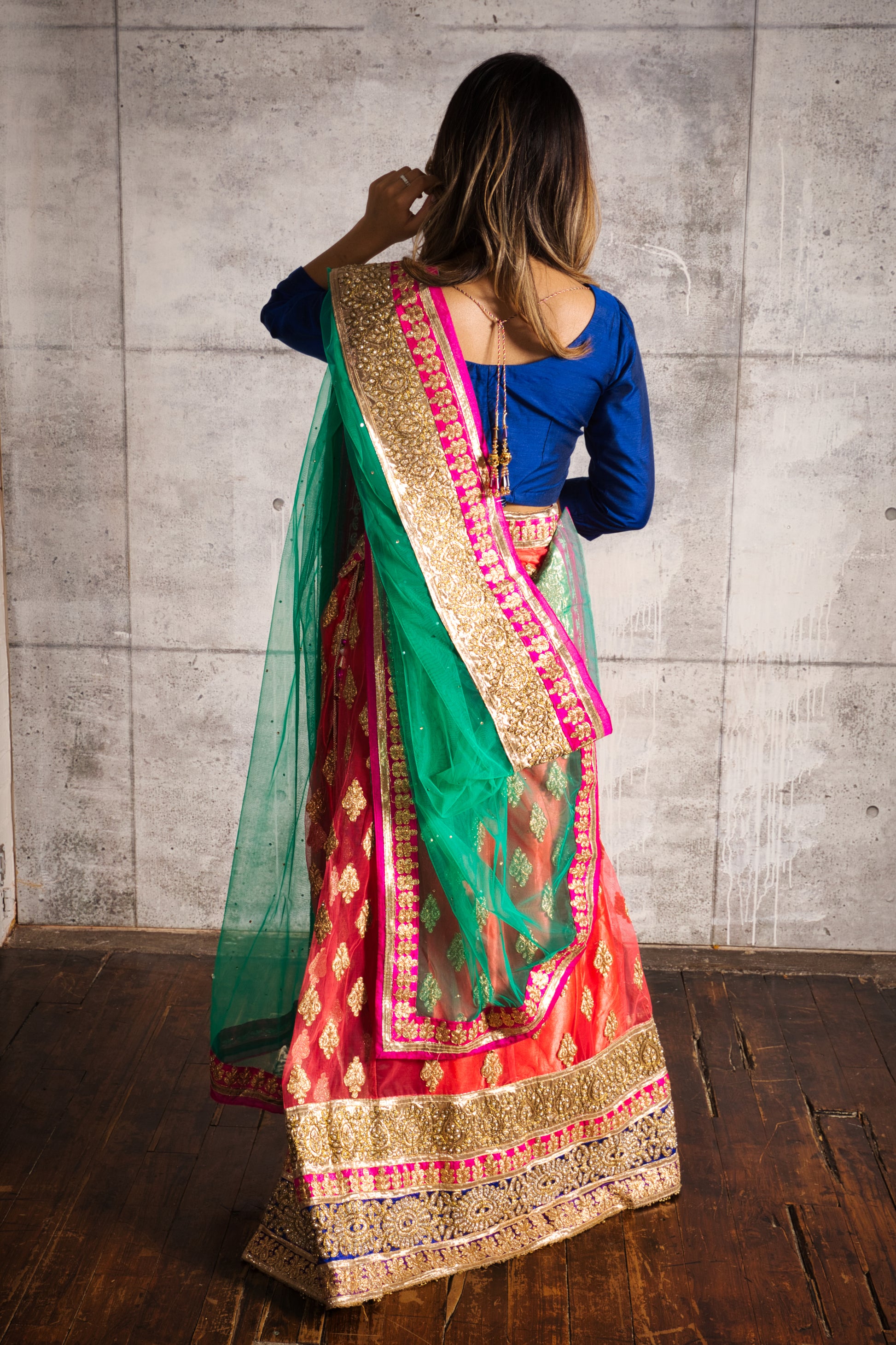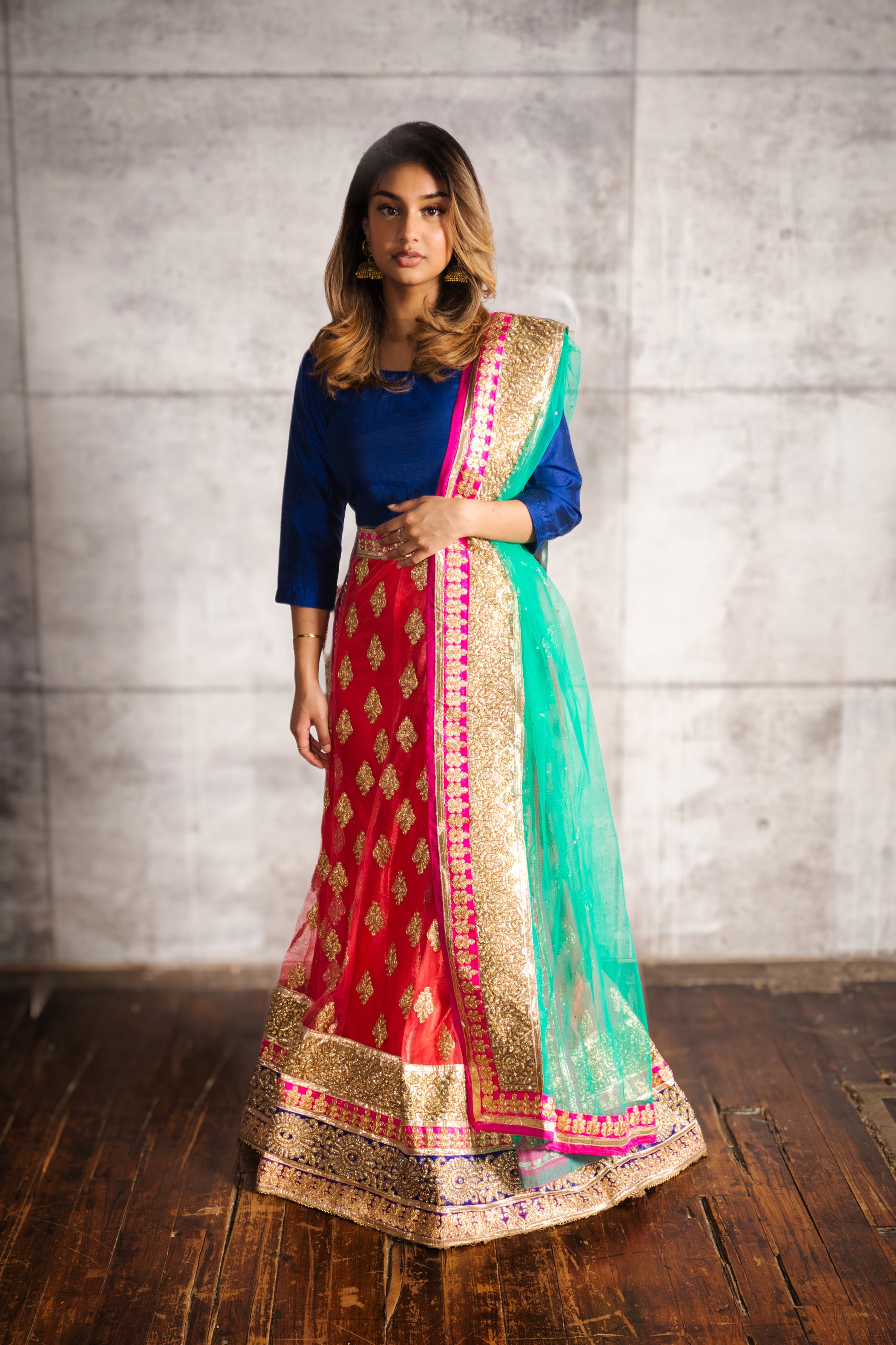 This is a gorgeous net ghagra with a plain raw silk choli and a net dupatta. The ghagra has gota, zari and sequins work across the entire garment.