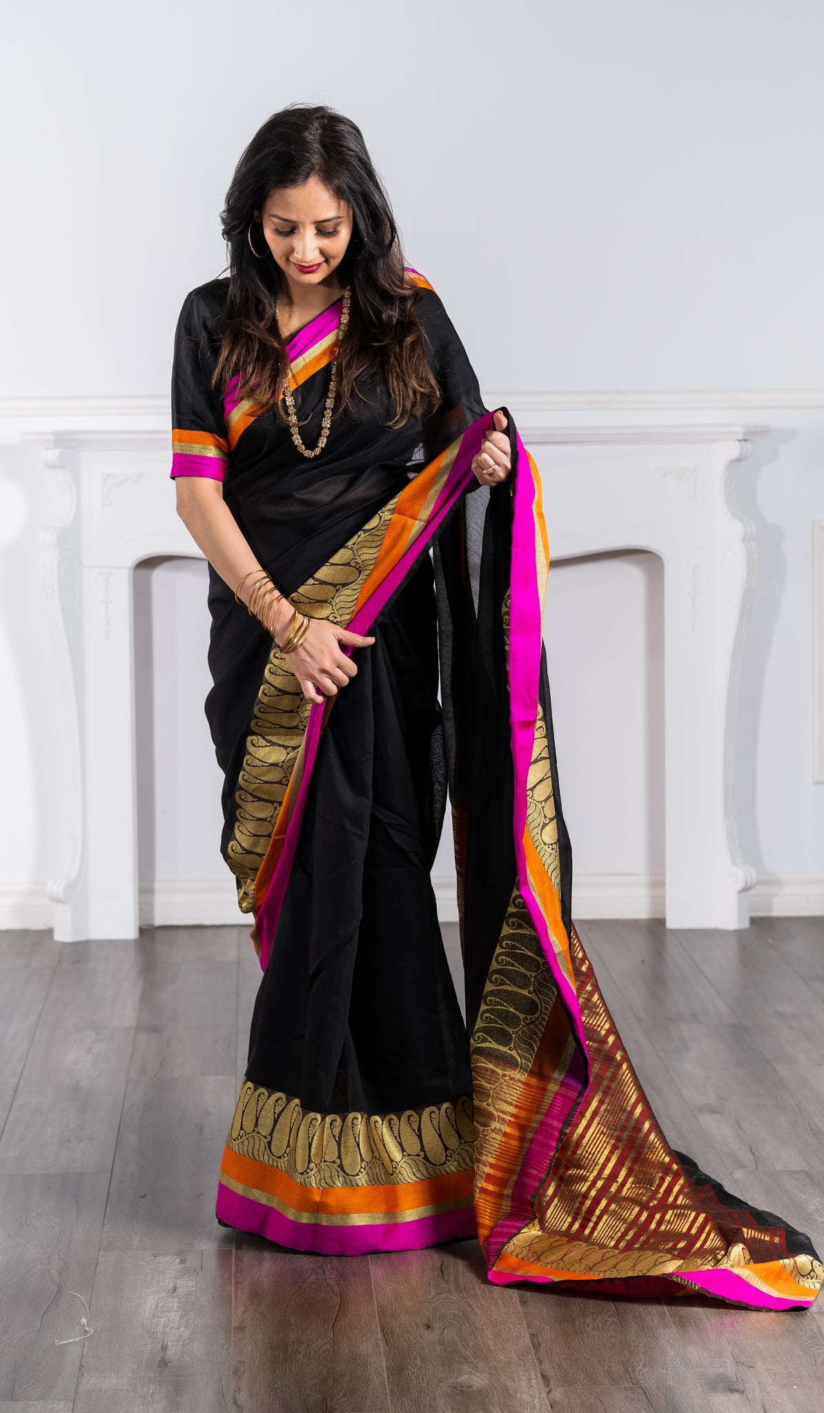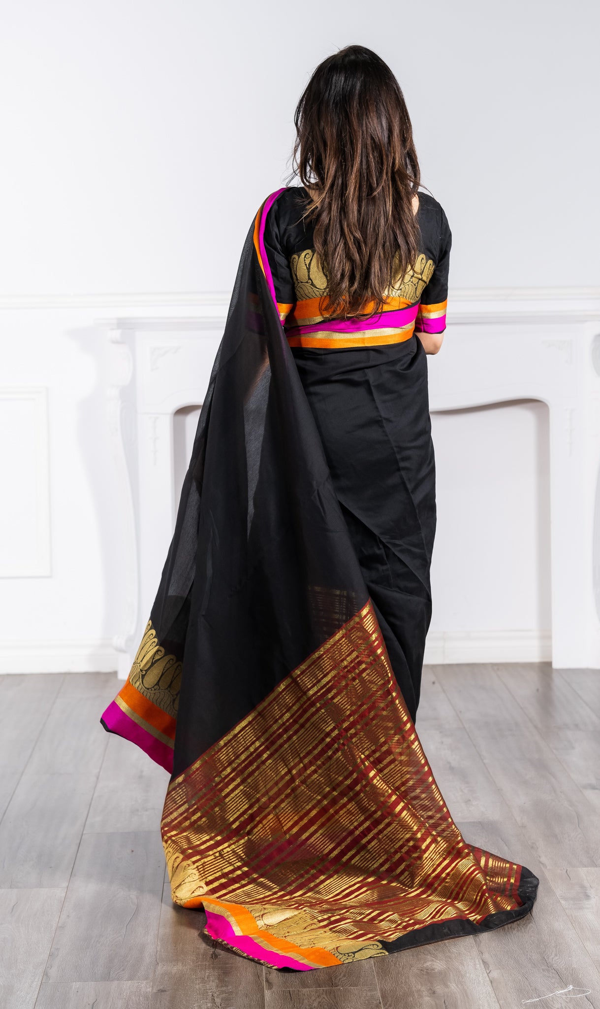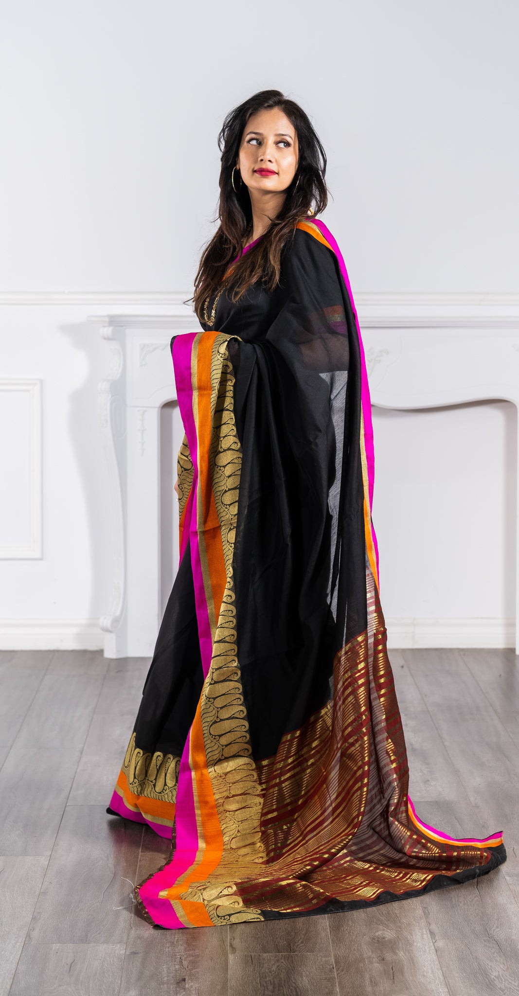 This is a black cotton messori banarsi saree with a golden and magenta border.