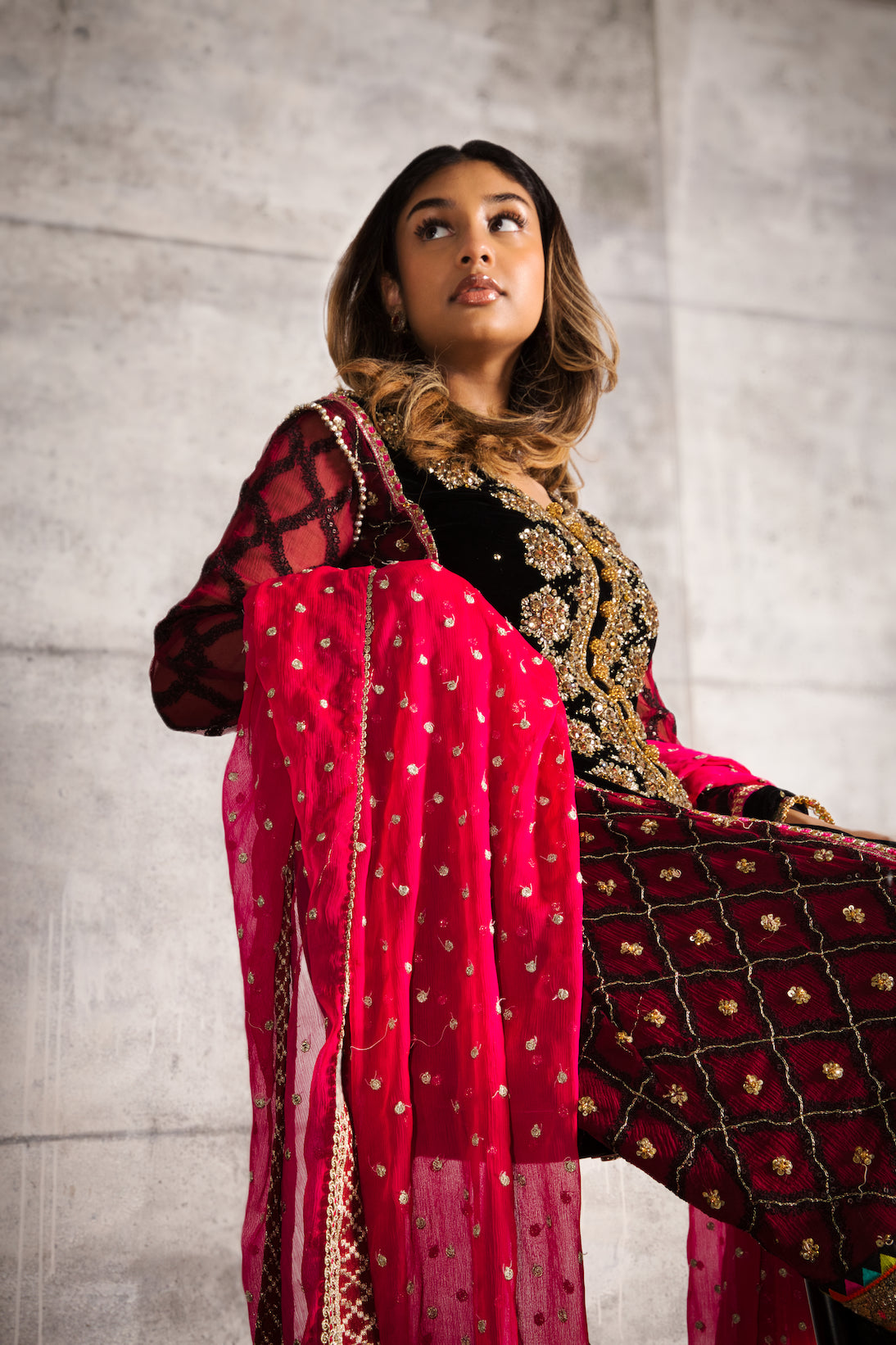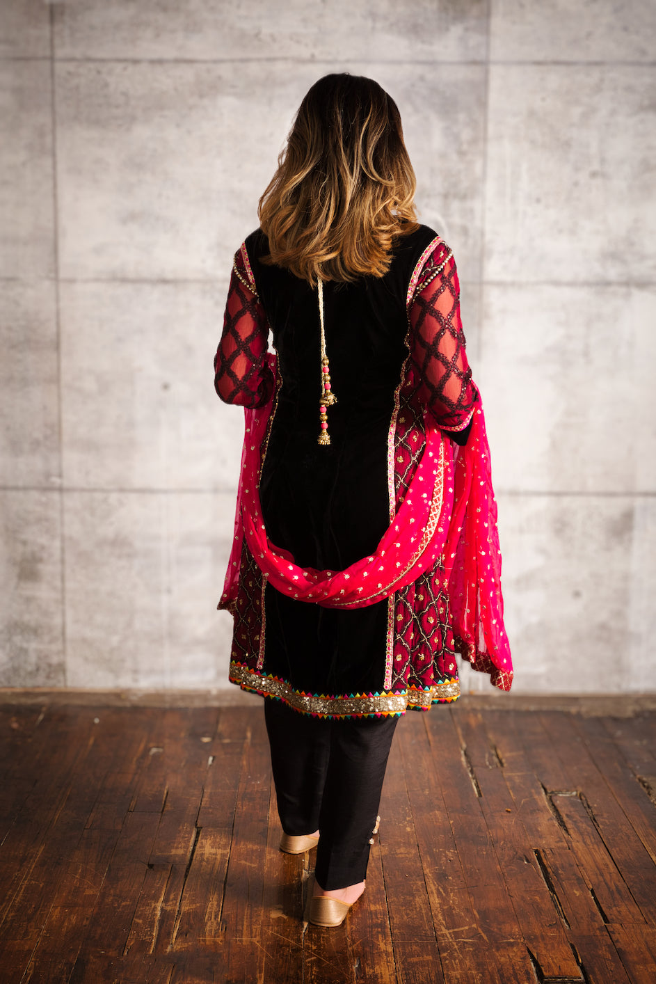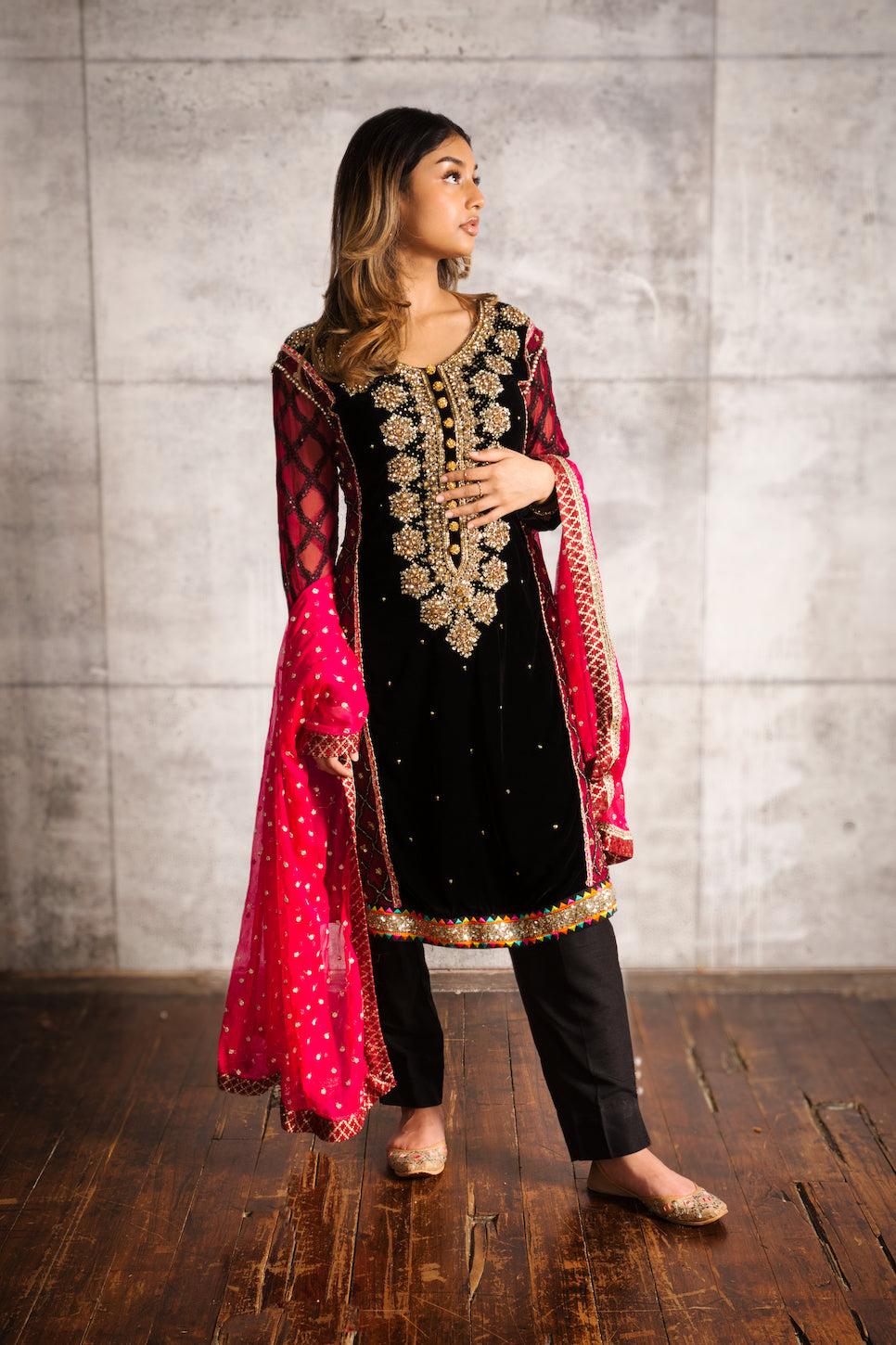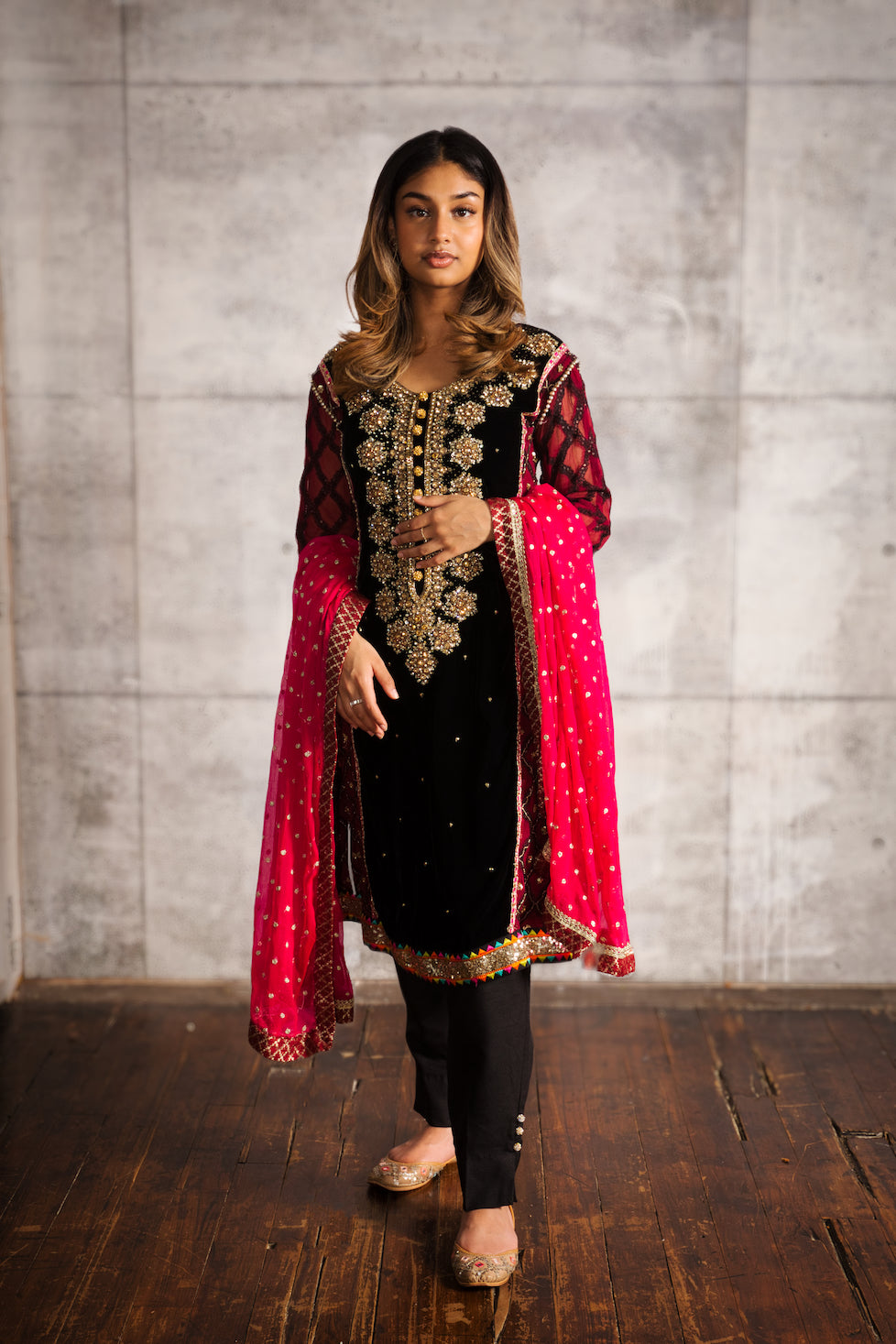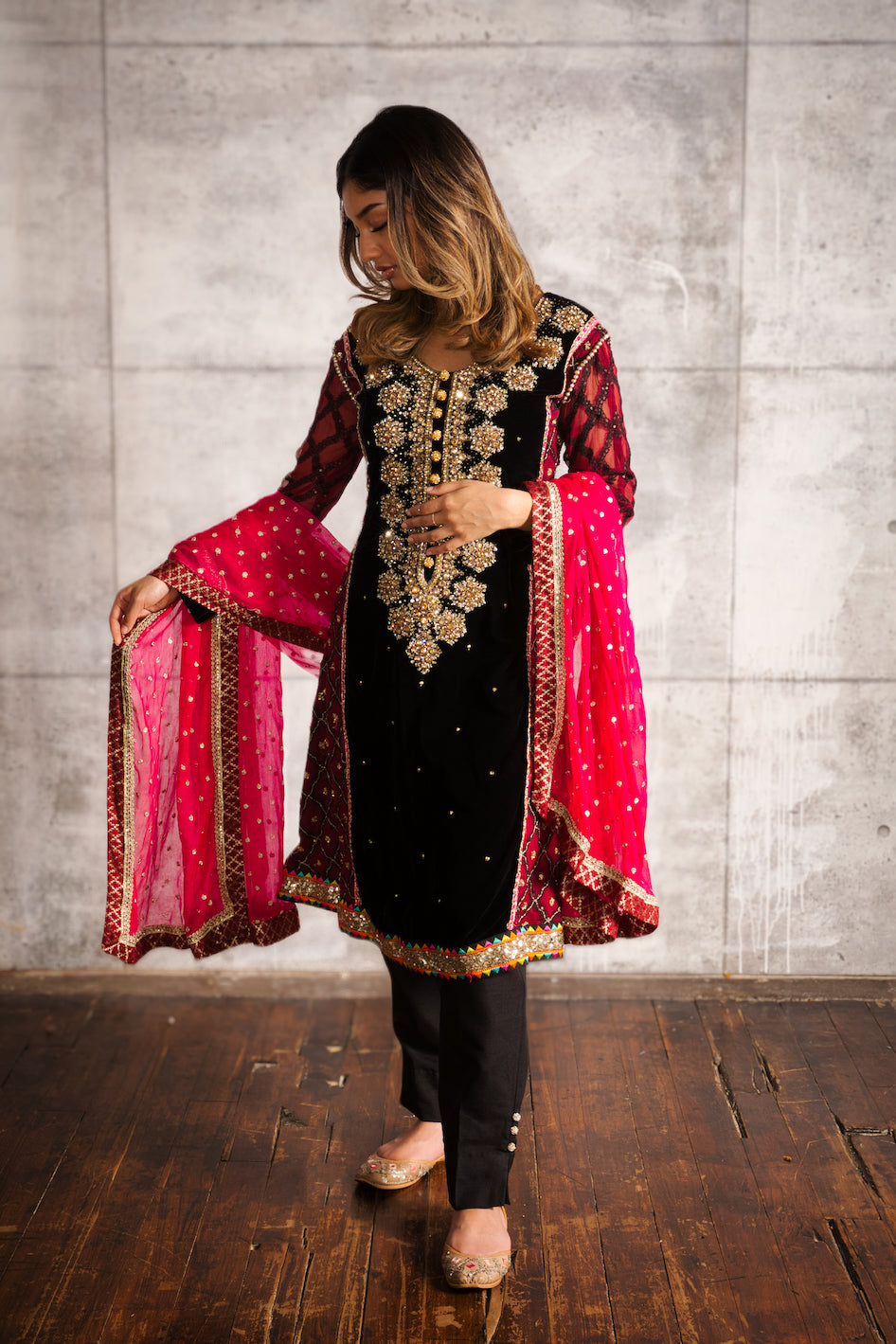 3 piece suit: includes a velvet/chiffon kameez, black trousers and a chiffon dupatta