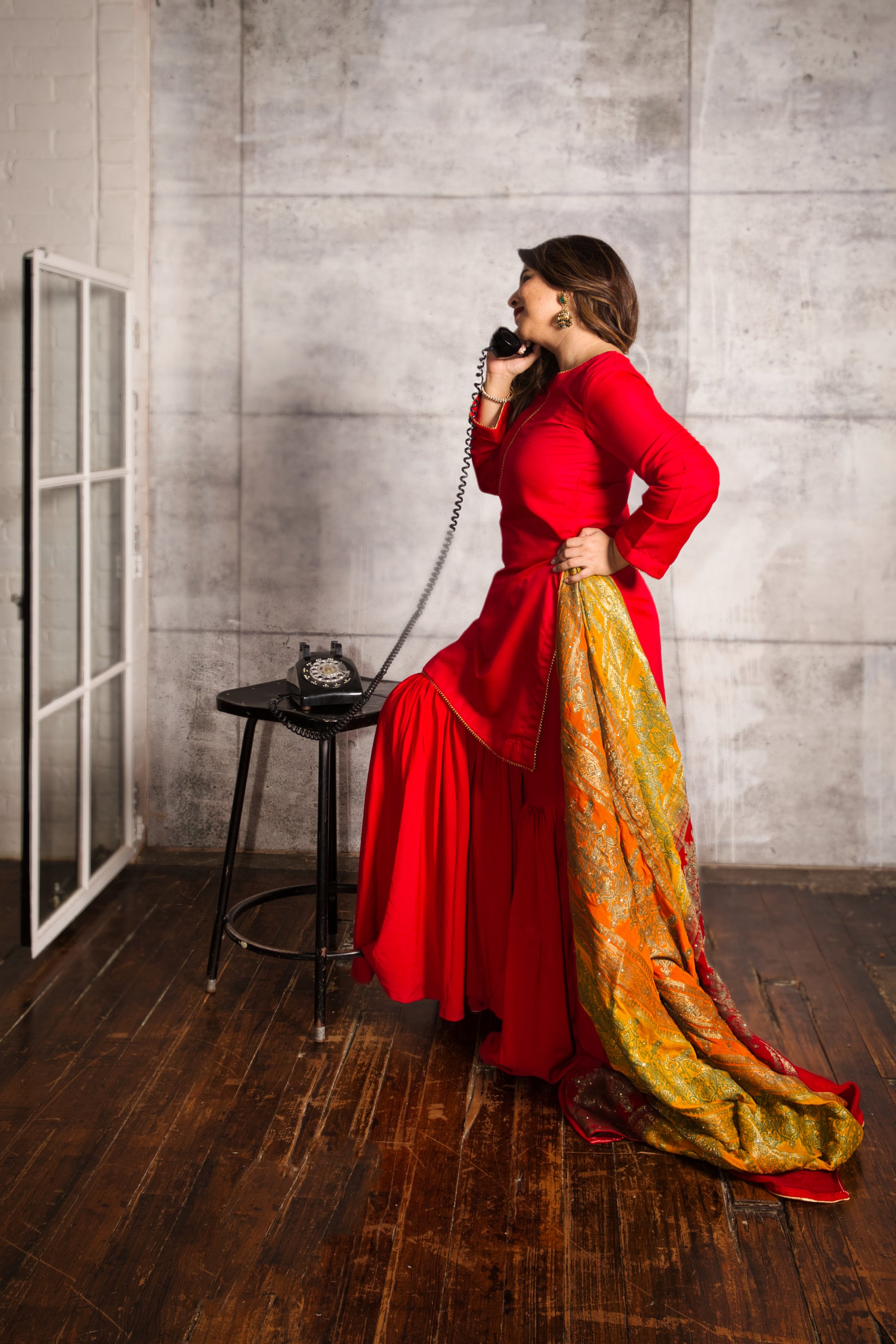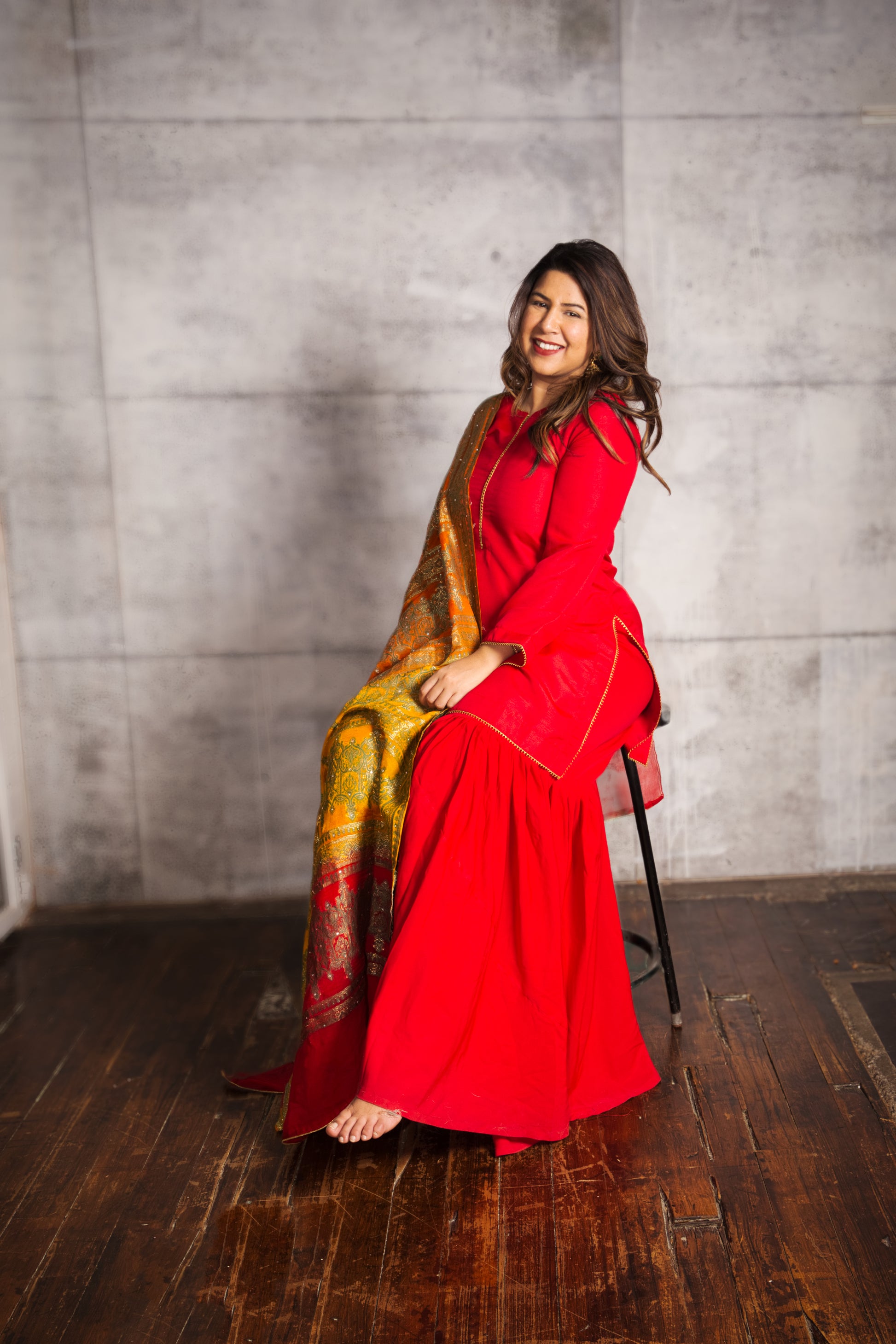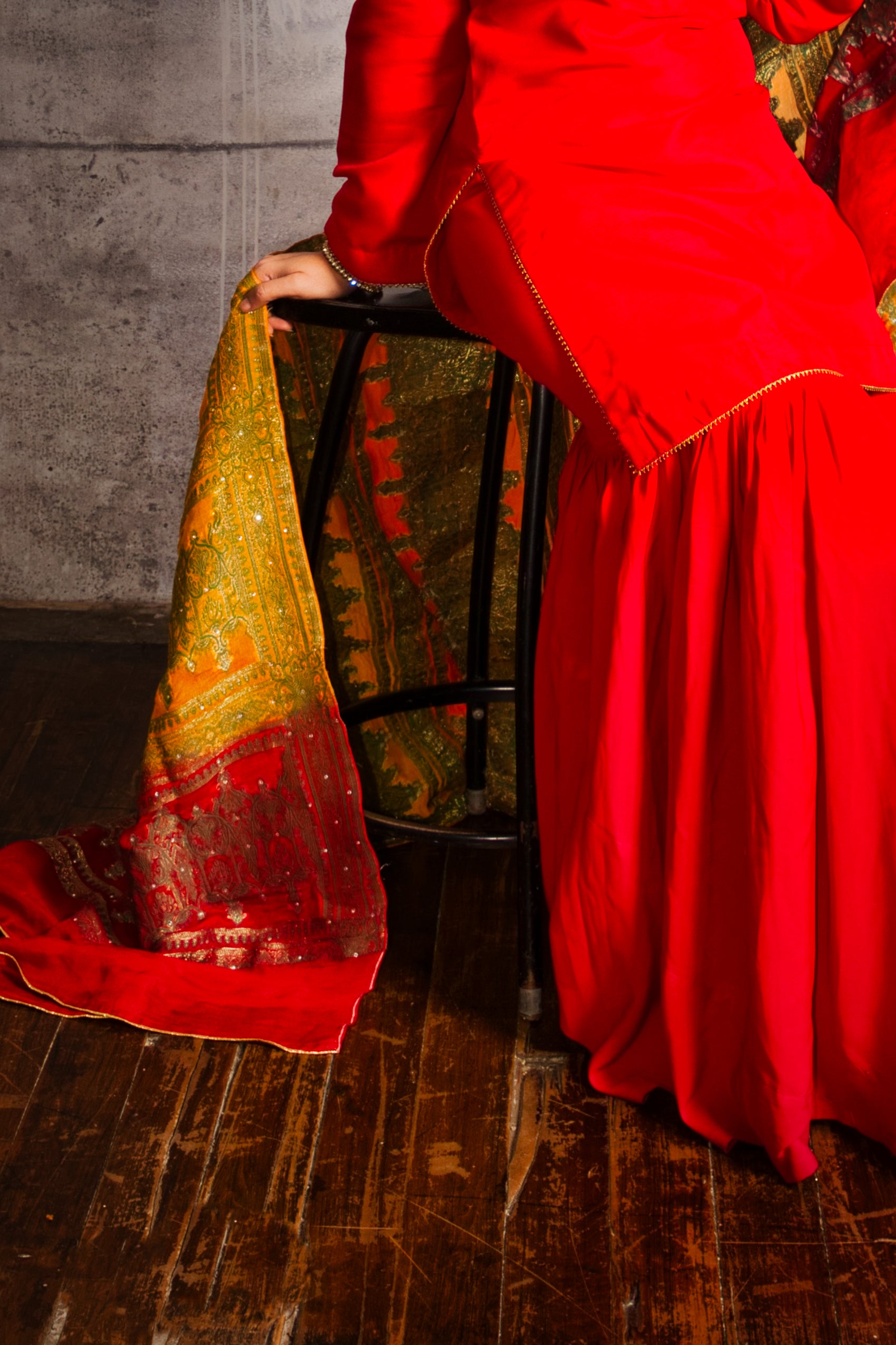 3 piece suit: includes the red shirt, (gharara or trousers) and the dupatta