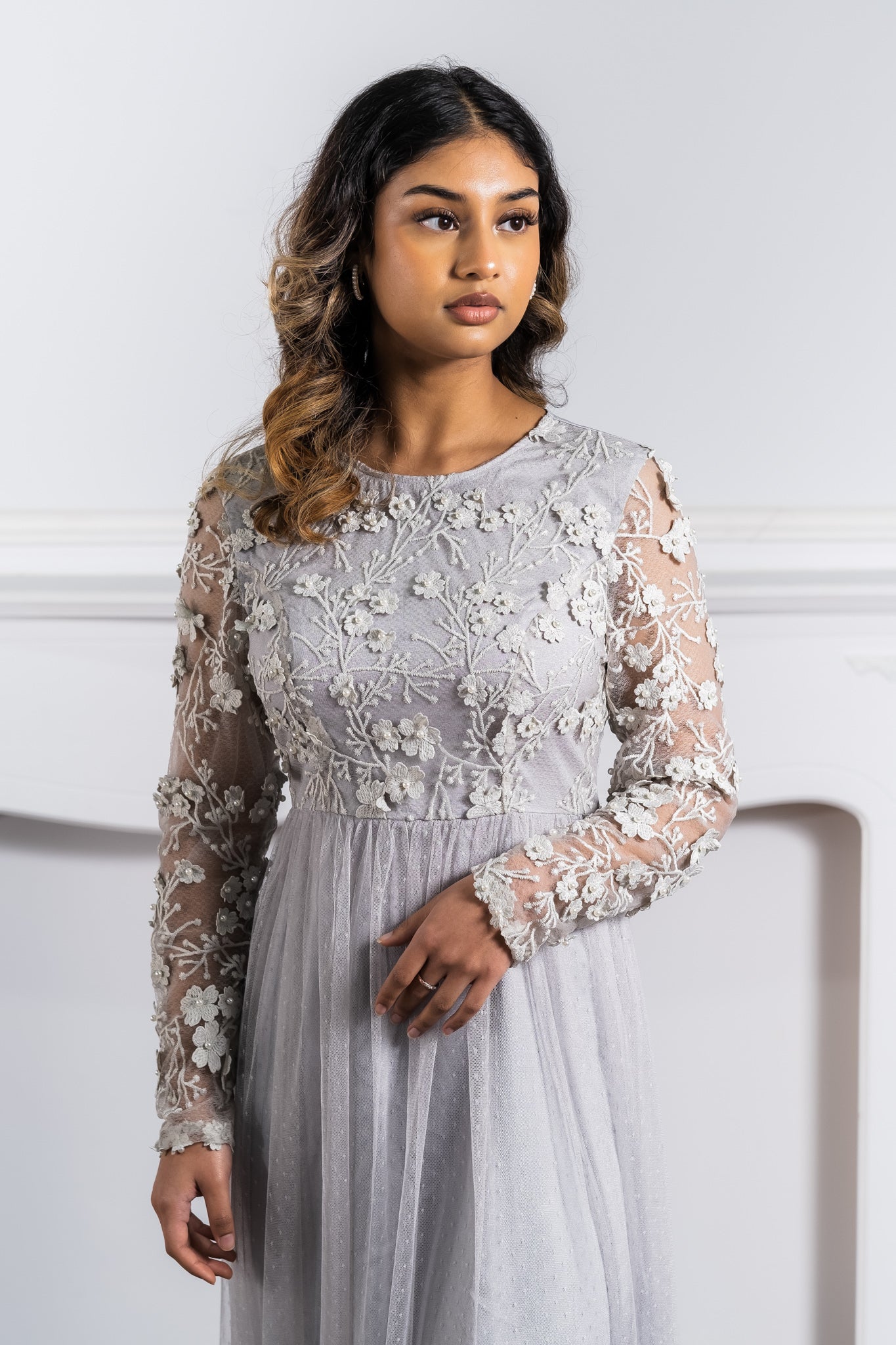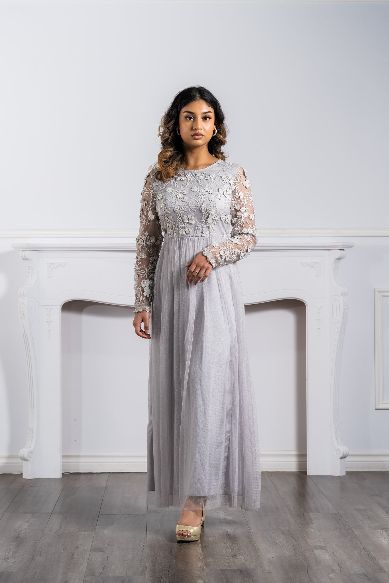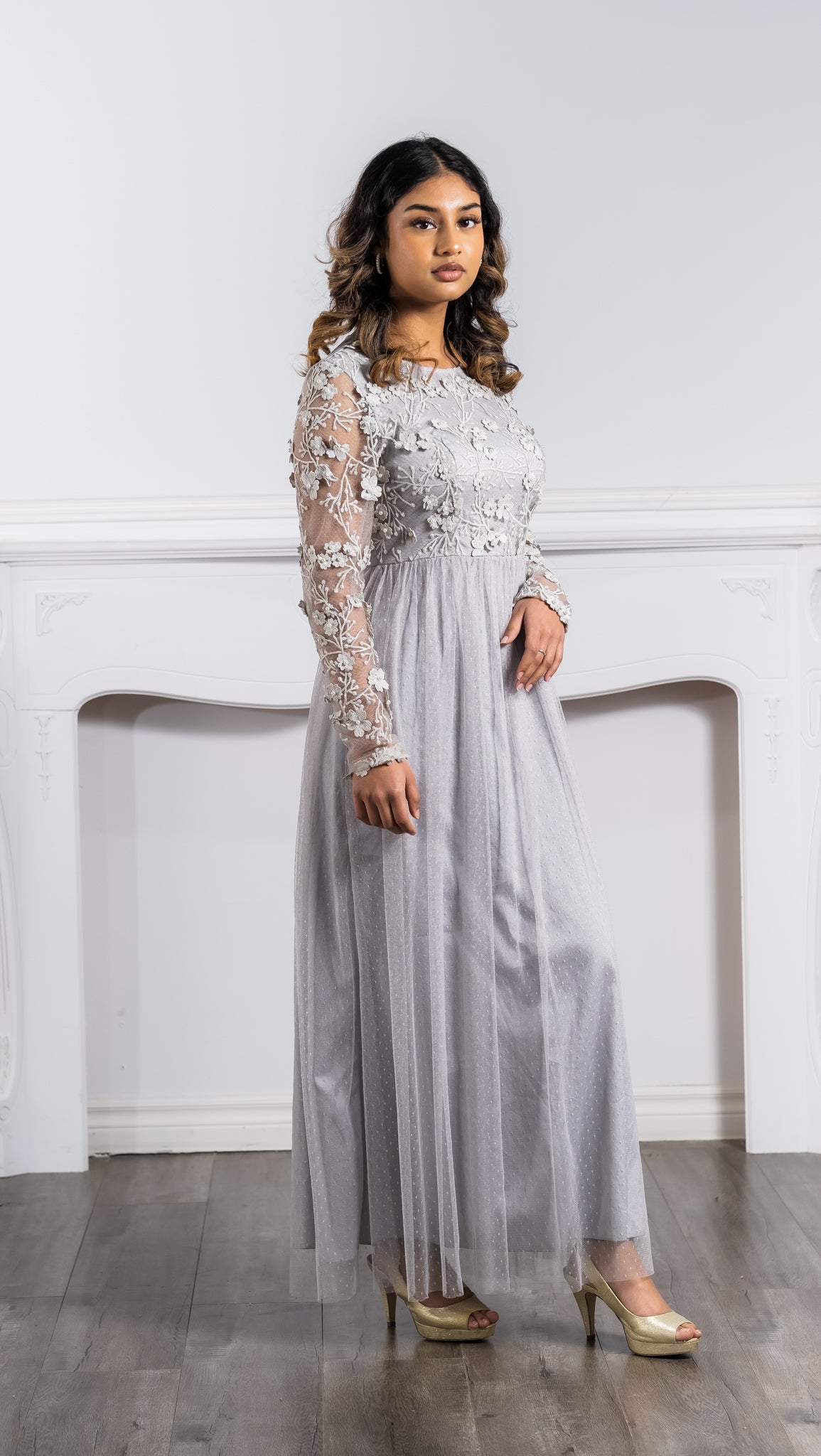 This is a long full sleeved chiffon/net dress with embroidery at the top.