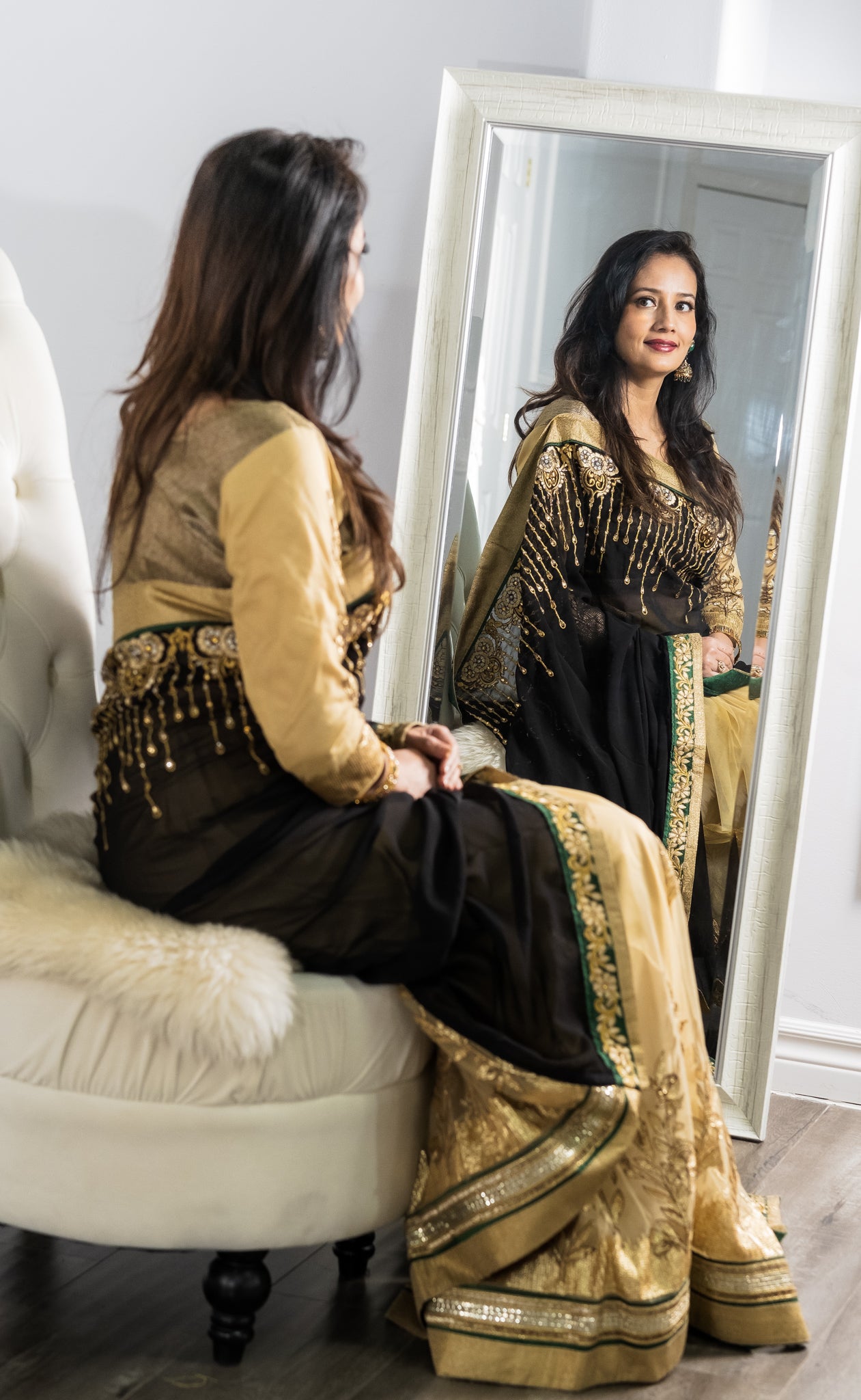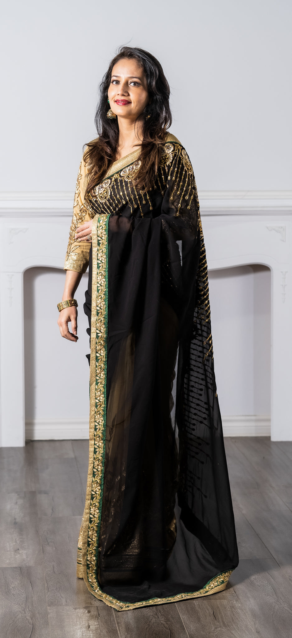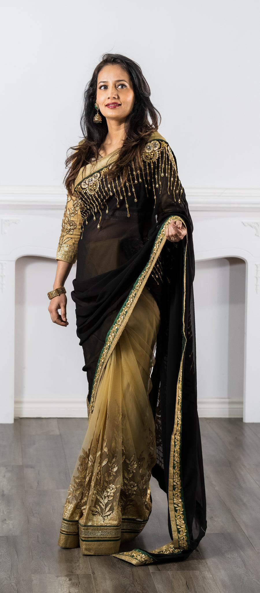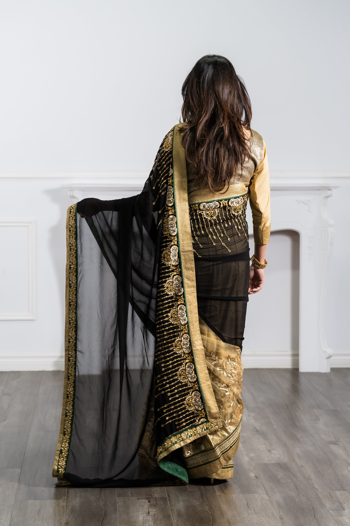 This is a black and fawn saree with gold and green border that is lined with zari work and sequins.