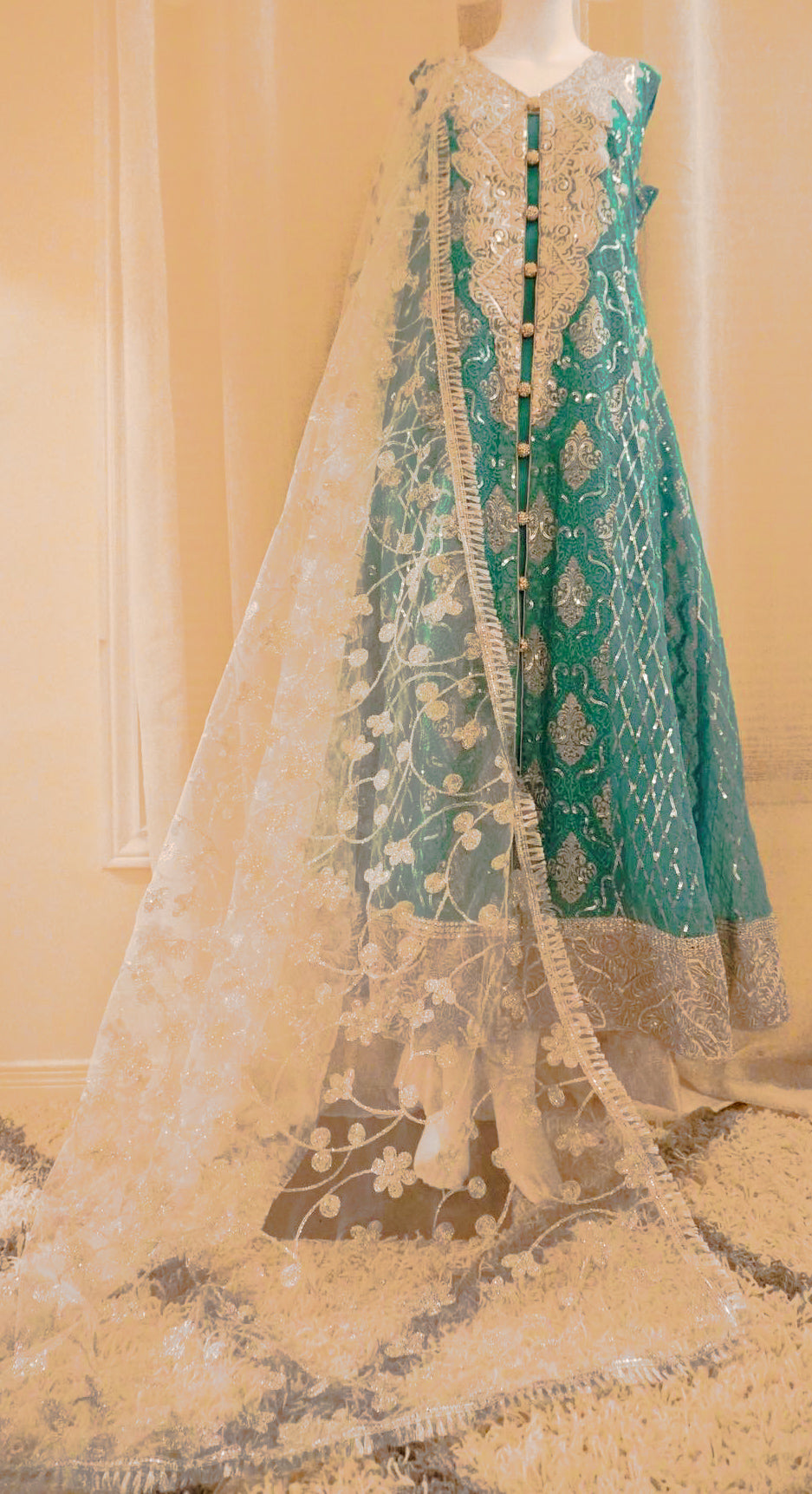 This is a sleeveless long dress with silver applique, zari and sequins work. This comes with a silver jacquard trouser and a silver dupatta.