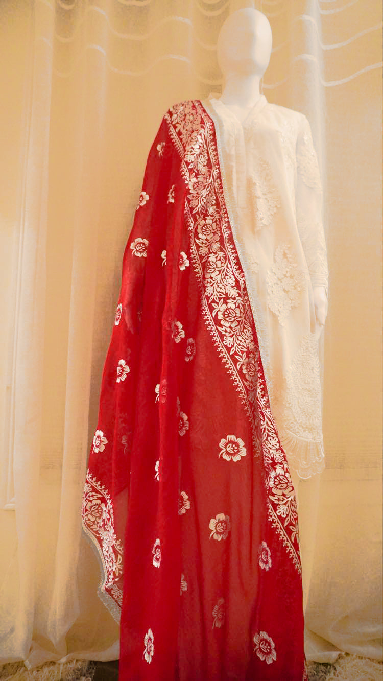This is a white tissue dress with resham, silver zari and sequins work. It comes with white trousers and a red chaapa dupatta.