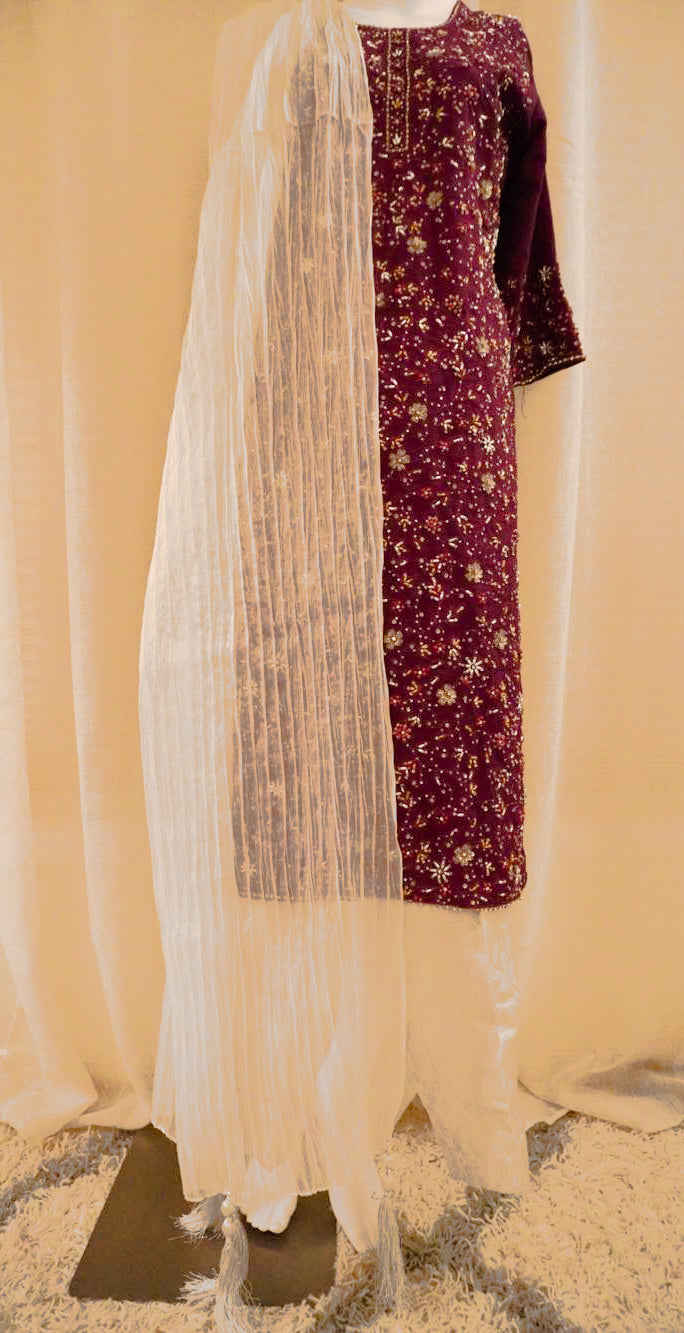 This is a purple raw silk shirt with sequins, silver beads and zari work. It comes with a tissue dupatta and silver jacquard trouser.